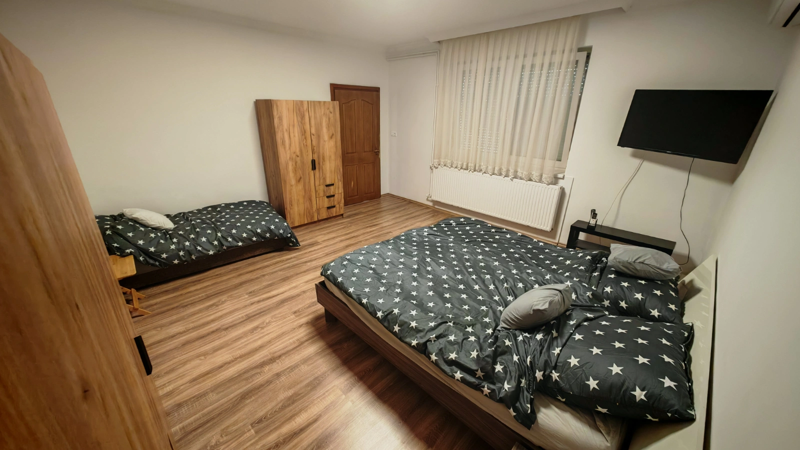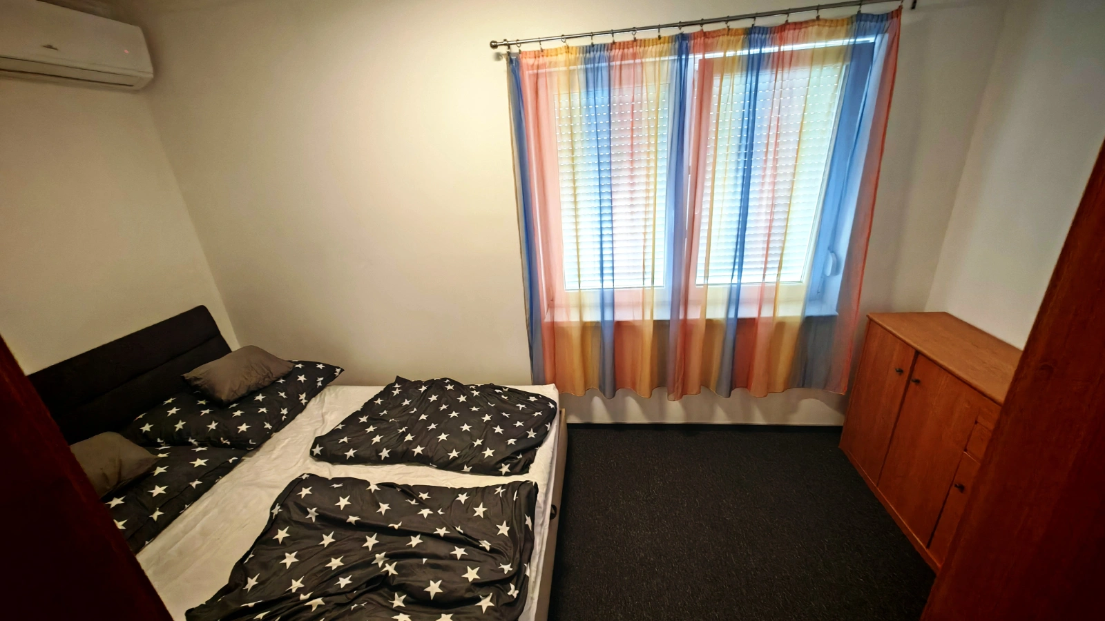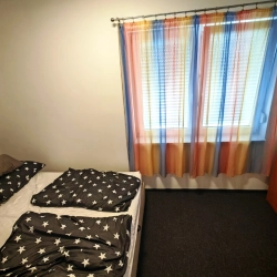 Ágyak: Hálószoba: 1 db dupla ágy, Másik szoba: 1 db dupla ágy 180x200 + 2 db szimpla ágy 90x200 (+ opcionálisan hordozható vendégágy)