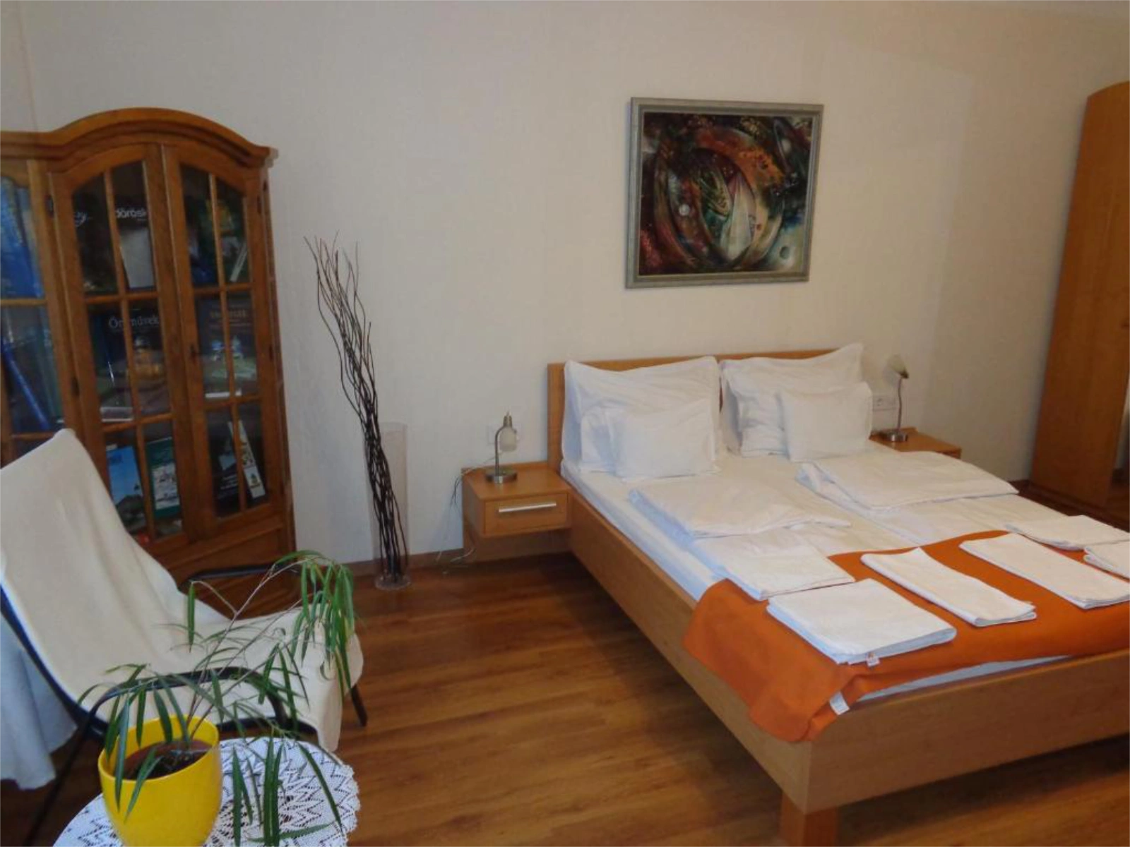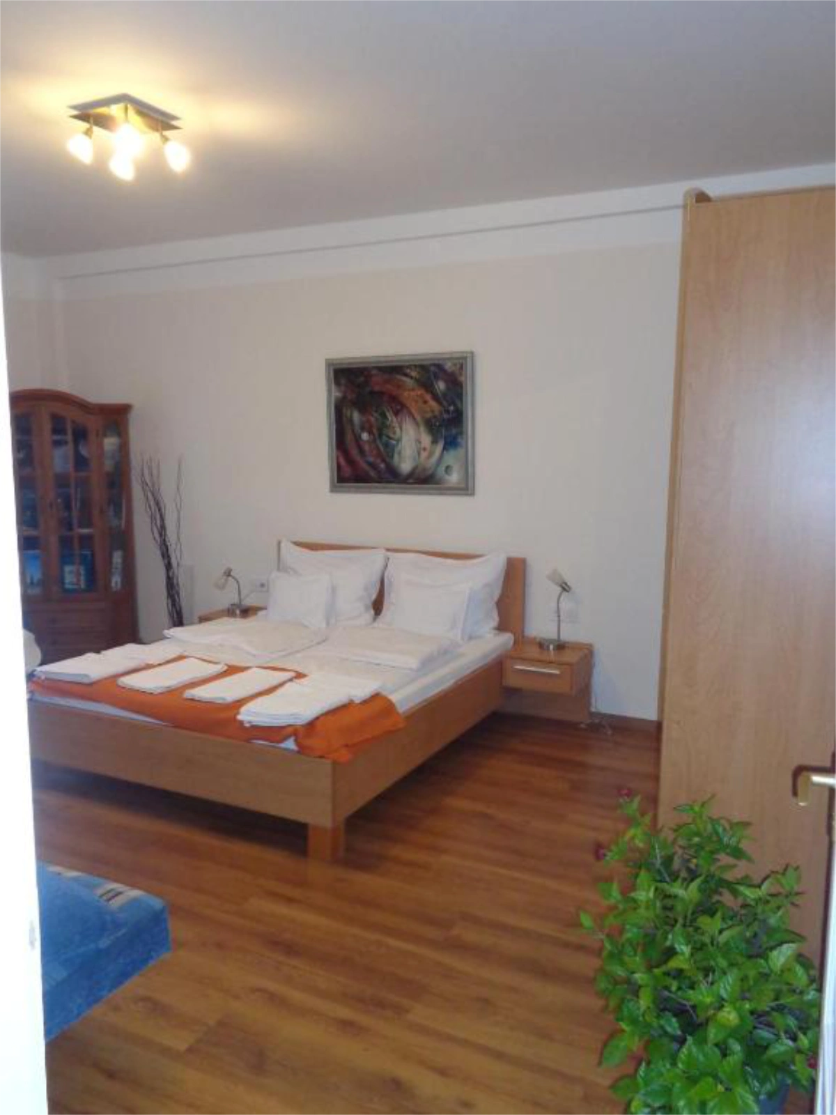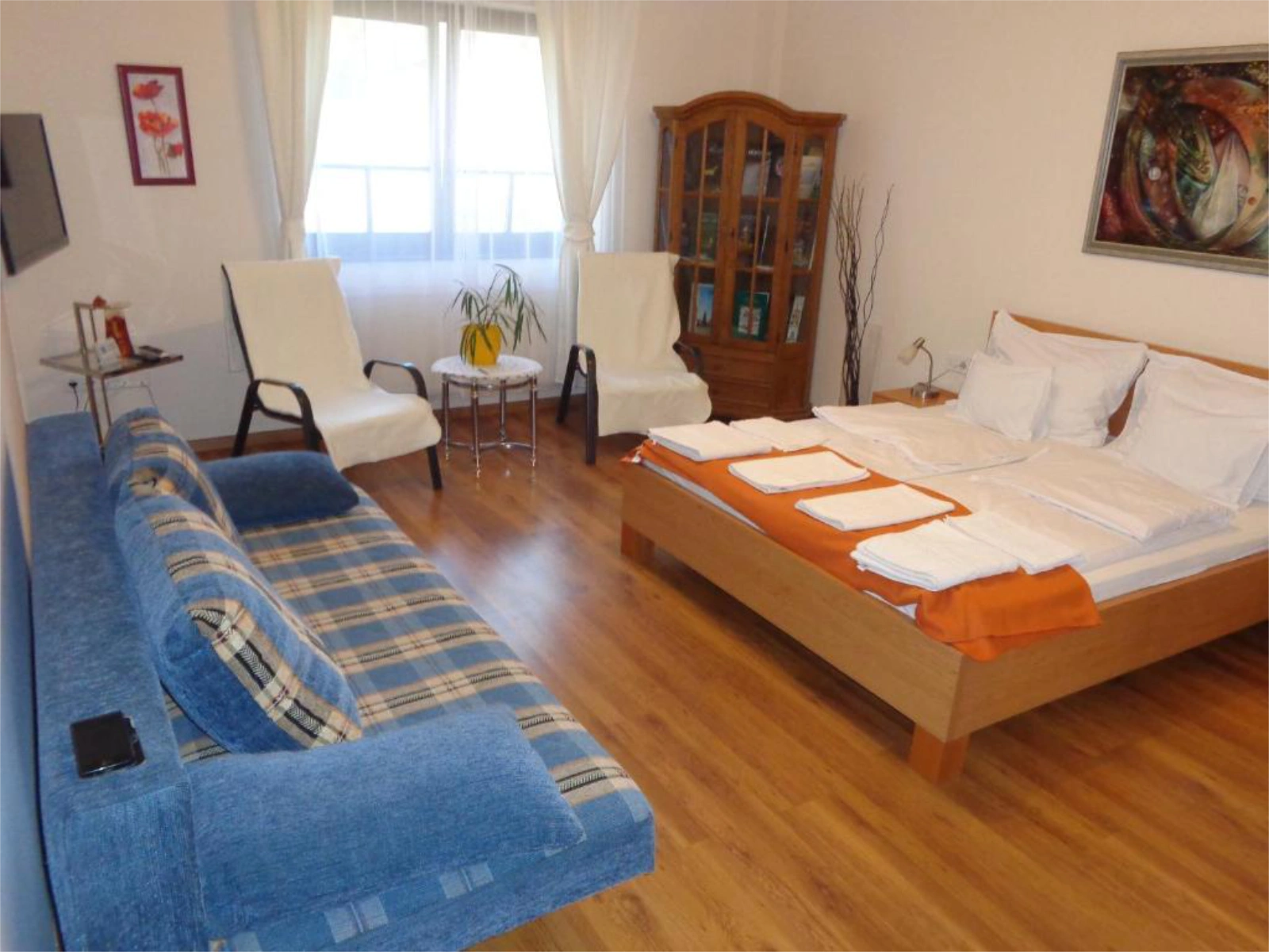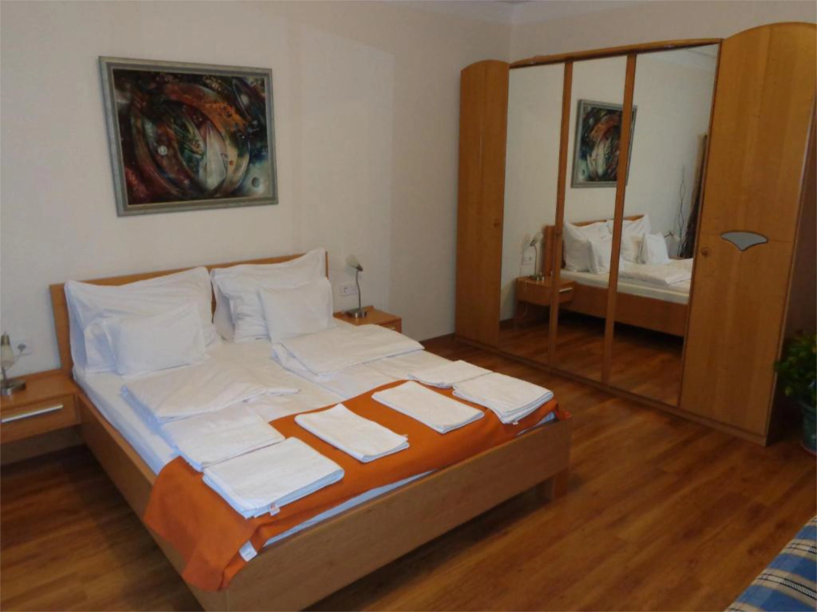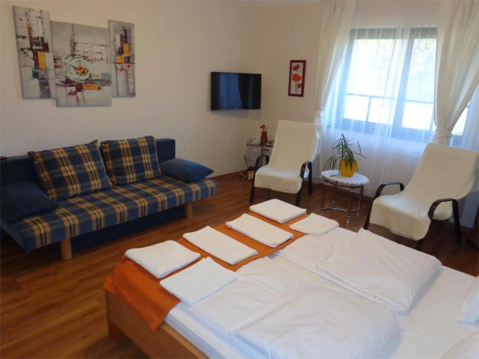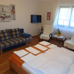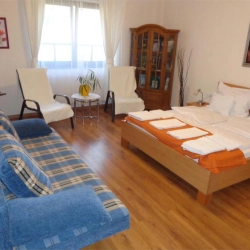 Ágyak: Hálószobák: 1 db dupla ágy + másik szobában dupla ágy + dupla kanapé (+opcionálisan hordozható vendégágy)
