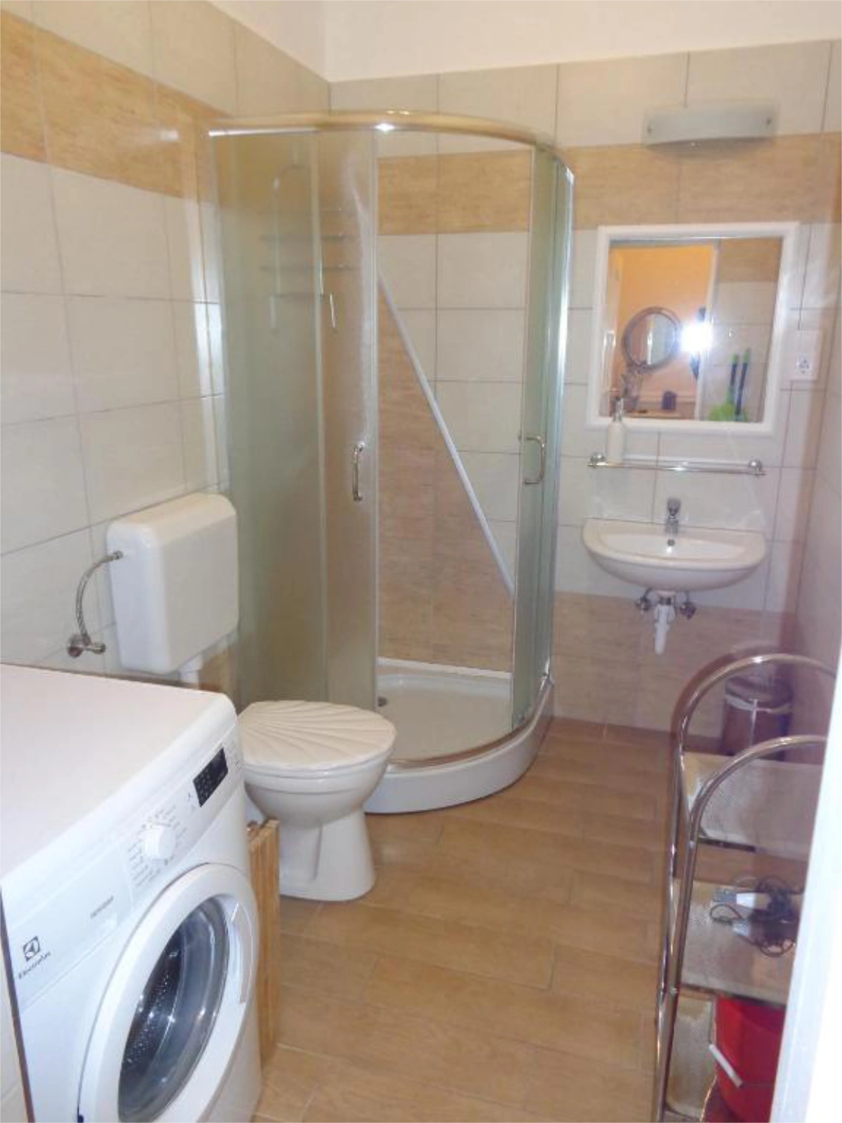 Fürdő: Zuhanyzó, WC, kézmosó tükörrel, mosógép